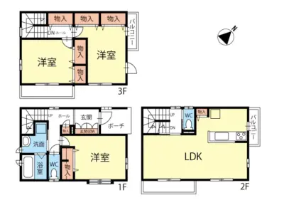 建物はヤマダ・エス・バイ・エルホーム 1階に居室と水回り(ユニットバス・脱衣洗面所・トイレ、2階には17.7畳のリビング・ダイニング・対面キッチン、3階に居室×2部屋